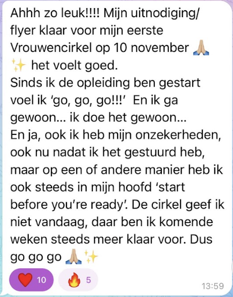 Over 6 weken open je jouw allereerste vrouwencirkel. Je zit daar, niet als ‘juf’ of ‘leider’, maar als spaceholder. De vrouwen voelen zich veilig, gedragen. Er wordt gelachen, gedeeld, gehuild. En het mooiste? Je doet dit op jouw manier. Met jouw stem, jouw ritme, jouw bedding vanuit rust en vertrouwen.