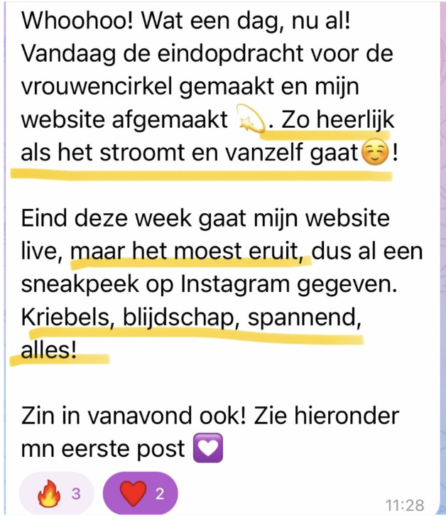Naast de online modules en bijbehorende video’s is er geen 1-1 op begeleiding vanuit Willemijn. Je kan je persoonlijke vragen stellen in de Telegram groep waar ook andere deelnemers in zitten.